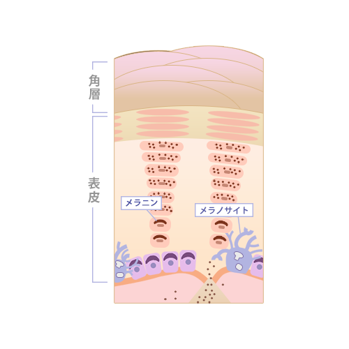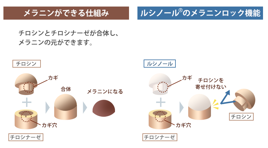 【ルシノール®】が、メラニン生成の原因である酵素「チロシナーゼ」の働きをブロックし、シミやくすみの根本にアプローチします。