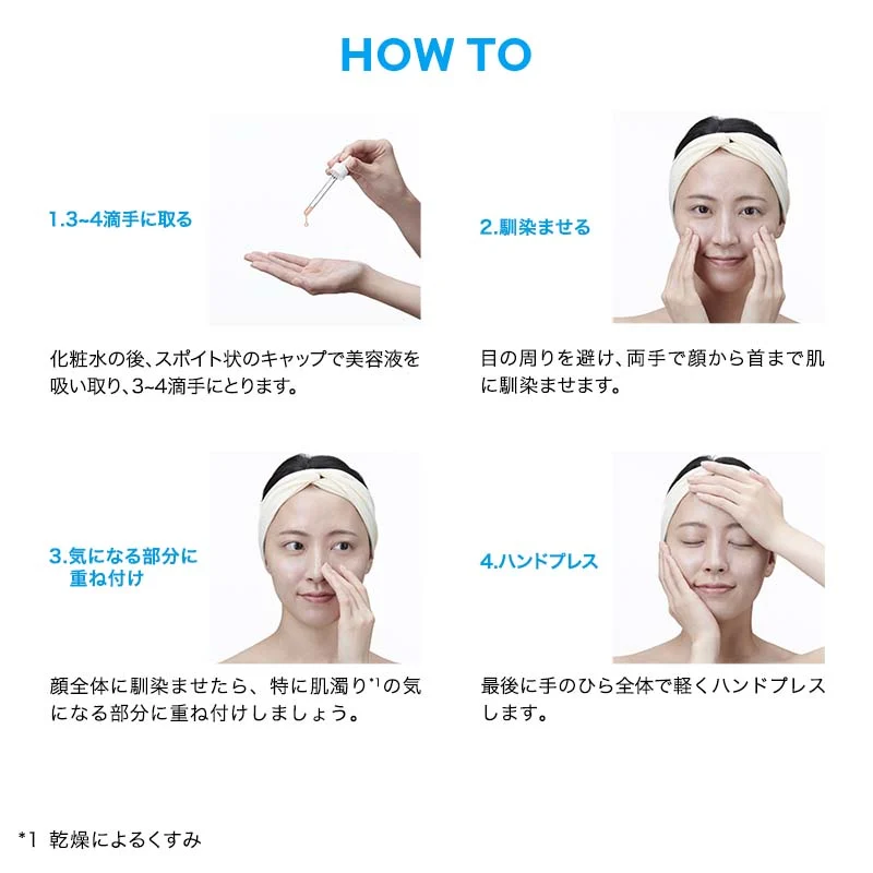 3〜4滴を清潔な手に取り、目の周りを避けて塗布し、やさしく馴染ませます。