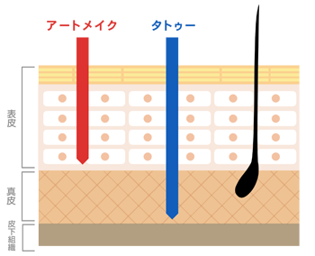 アートメイクとは皮膚に専用の針で色素を注入していく技術です。 工程はタトゥーと一緒ですが、タトゥーは皮膚の深い層まで針を刺し、色を定着させるので半永久的に残ります。 ですが、アートメイクは皮膚の浅い層に色素を入れていくのでターンオーバーにより自然に抜けていきます。