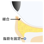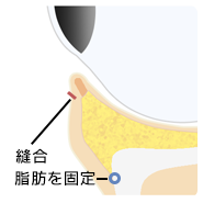 眼窩下縁を剥離し、脂肪を包んでいる膜と脂肪を凹んでしまっている部分に移動させ、余分な脂肪を切除し、骨膜に固定をします。吸収される糸を使用するので抜糸の必要はありません。