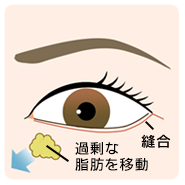 下まつげの下1〜2ミリの表側の皮膚を切開し、突出した脂肪を目の下の窪みに移動させます。同時に余剰皮膚がある場合は皮膚の切除も出来るので突出が大きく、たるみが強い方におすすめです。主に50代以降の方に適応します。
