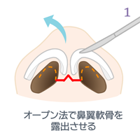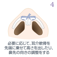 アジア人は皮膚が厚く、軟骨が小さい方が多いため、鼻尖形成単独の手術では劇的な効果を出すことは難しく、通常は耳介軟骨移植や鼻中隔延長と併用して行うことになります。